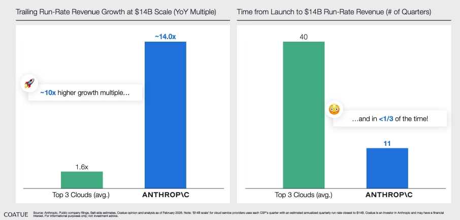 A velocidade dessa criação de valor é sem precedentes. Segundo análise da Coatue (fevereiro de 2026)7, a Anthropic atingiu um run-rate de receita de US$ 14 bilhões em apenas 11 trimestres desde o lançamento - menos de um terço do tempo que os três maiores provedores de nuvem levaram para alcançar a mesma escala. Mais impressionante ainda: nesse patamar, a Anthropic cresce a um múltiplo de ~14x ano contra ano, quase 10 vezes o ritmo médio dos grandes provedores de nuvem na mesma escala de receita.